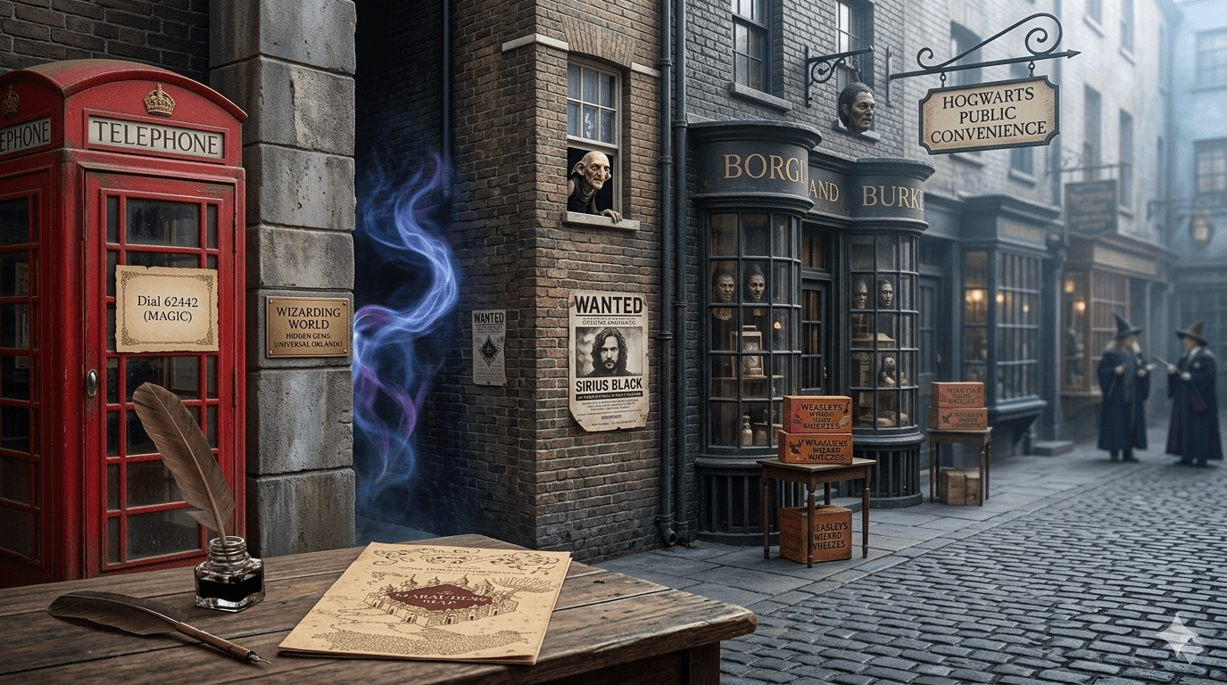 London’s phone box, Grimmauld Place, Knockturn Alley, Moaning Myrtle, and more small Wizarding World moments across Universal Studios Florida and Islands of Adventure.