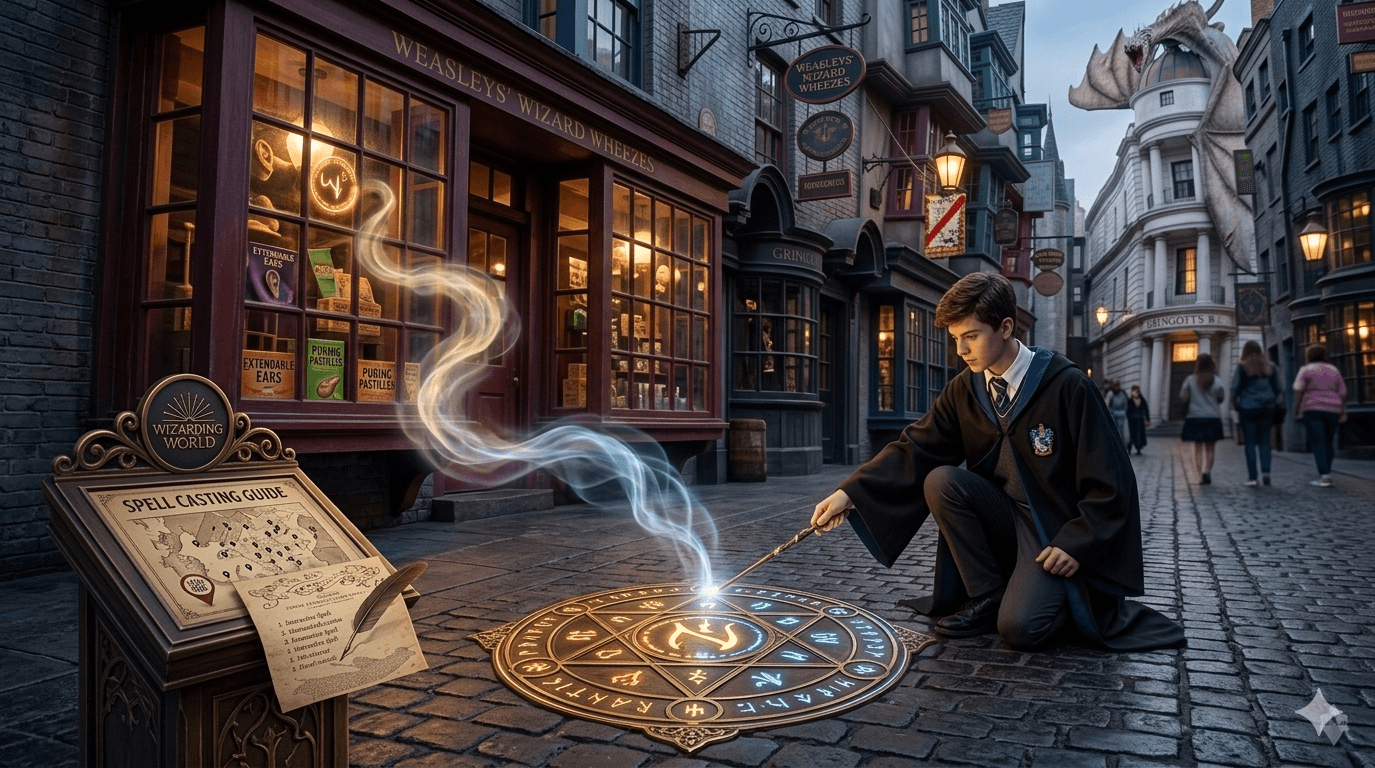 A full guide to interactive spell spots in Diagon Alley and Hogsmeade: buying a wand, reading the map, gestures, etiquette, and tips so your day feels magical instead of frustrating.